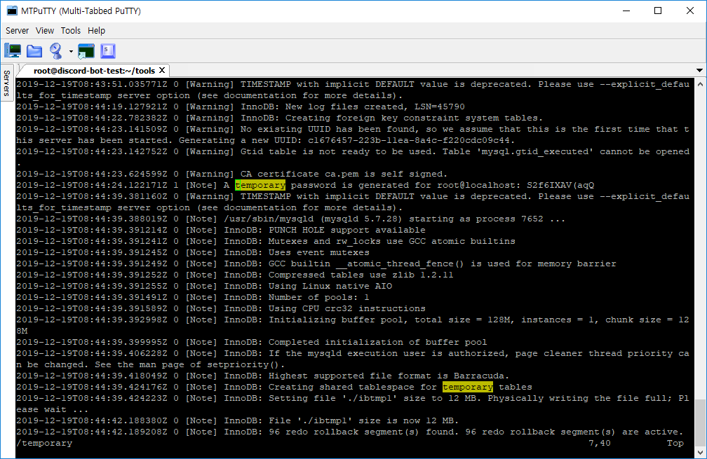 2019-12-19T08:44:24.122171Z 1 [Note] A temporary password is generated for root@localhost: (임시 비밀번호 - 생략)
