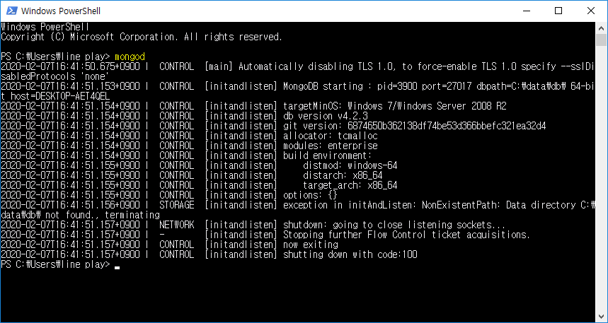 > STORAGE [initandlisten] exception in initAndListen: NonExistentPath: Data directory C:\data\db\ not found., terminating