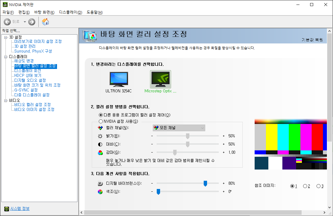 (1) 바탕화면 > 마우스 우클릭 > NVIDIA 제어판 > 디스플레이 > 바탕화면 컬러 설정 조절
