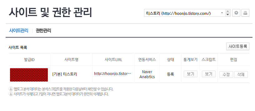 > 사이트를 등록하고나면 아래와 같이 발급 ID가 생성됨.