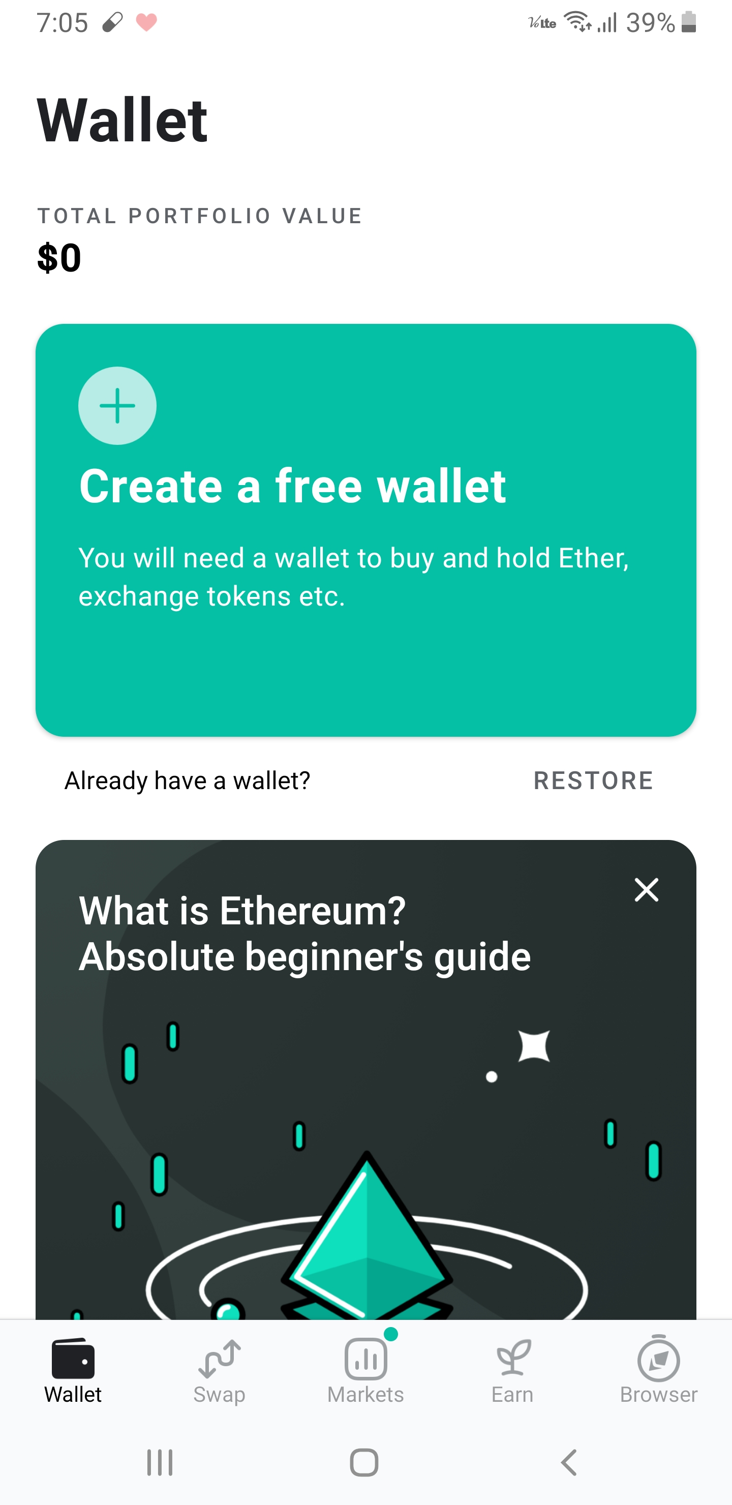 | 앱 설치 | 앱 설치 | 앱 실행 후 'Create a free wallet' 클릭 |