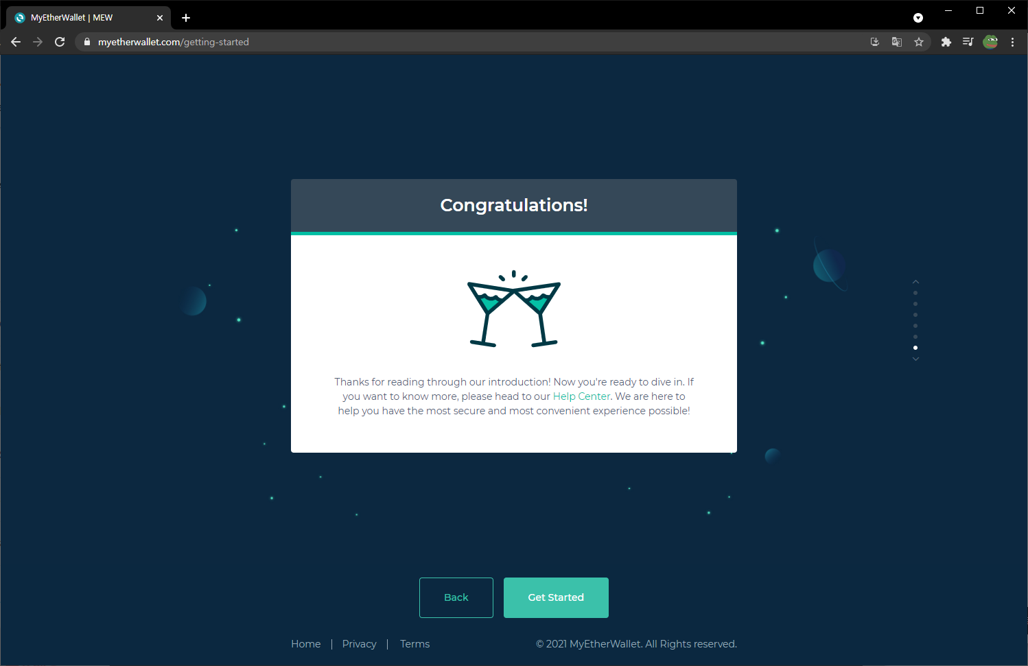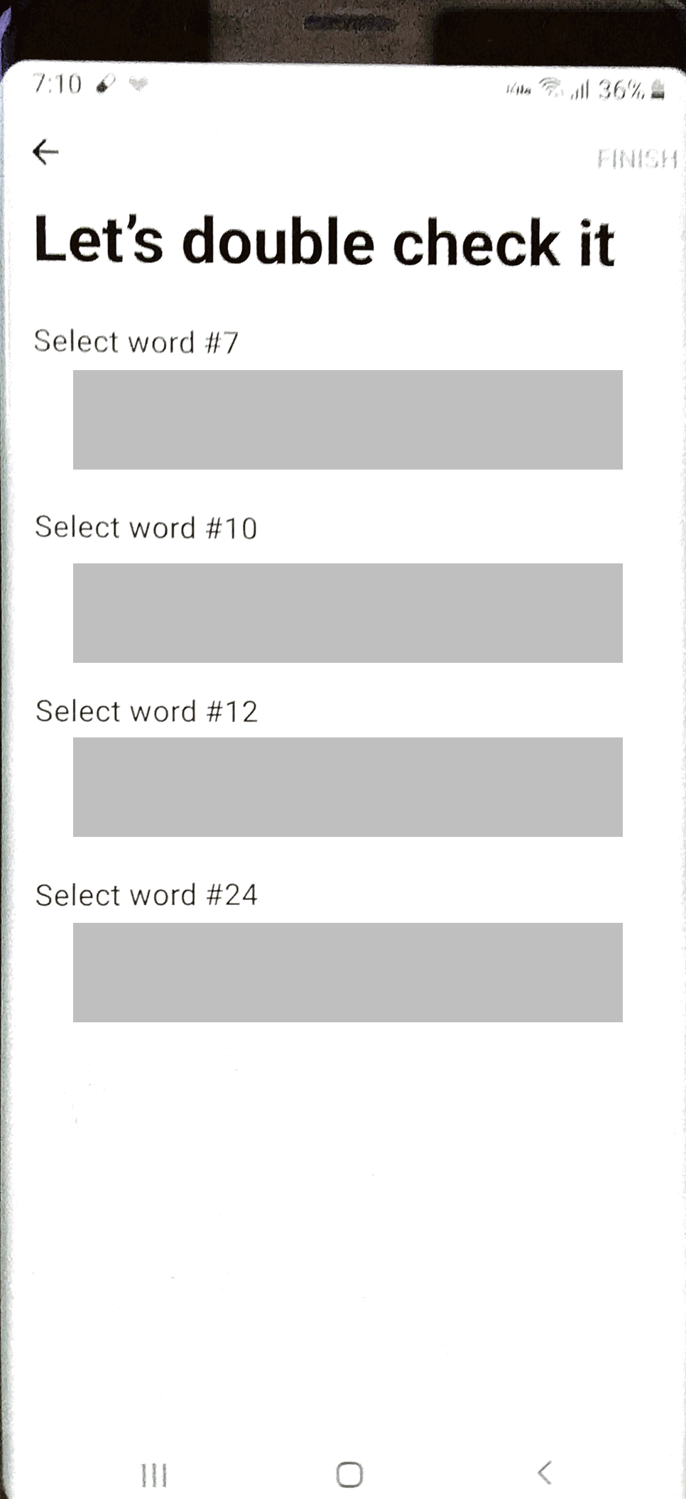 앞단계의 내용중 해당되는 내용을 선택 후 'Finish' 클릭 | 'Done' 클릭 | 지갑 생성 완료 |