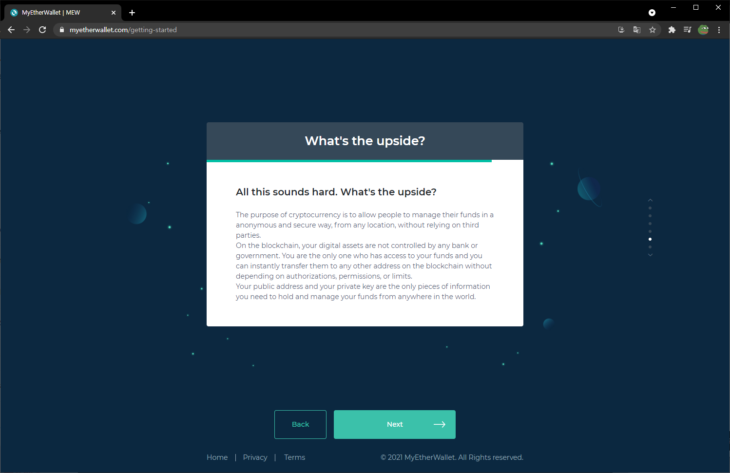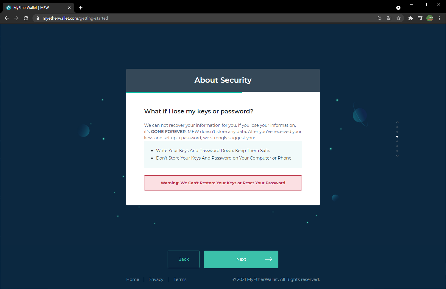 | 'Start using mew wallet' 클릭 | 'Backup Now' 클릭 : 추후 복구를 위한 설정을 진행하기 위함. |