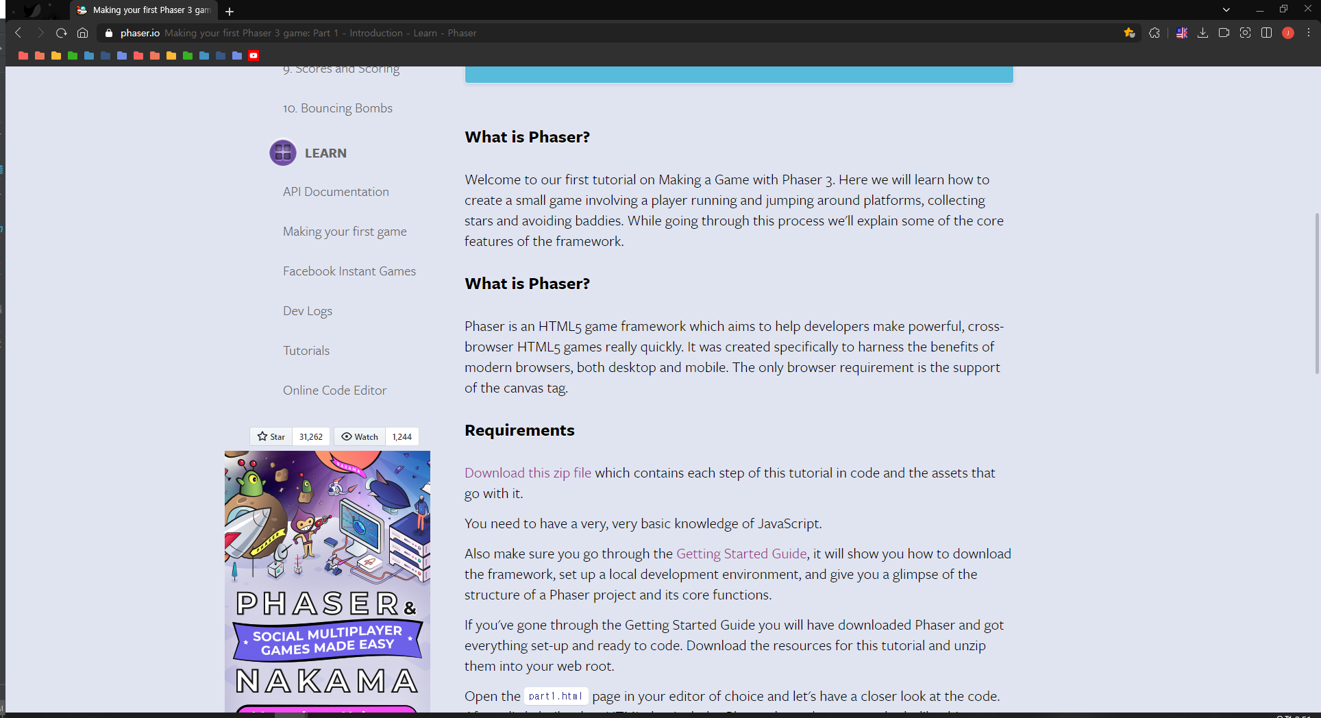 공식 사이트 튜토리얼 페이지 - https://phaser.io/tutorials/making-your-first-phaser-3-game/part1