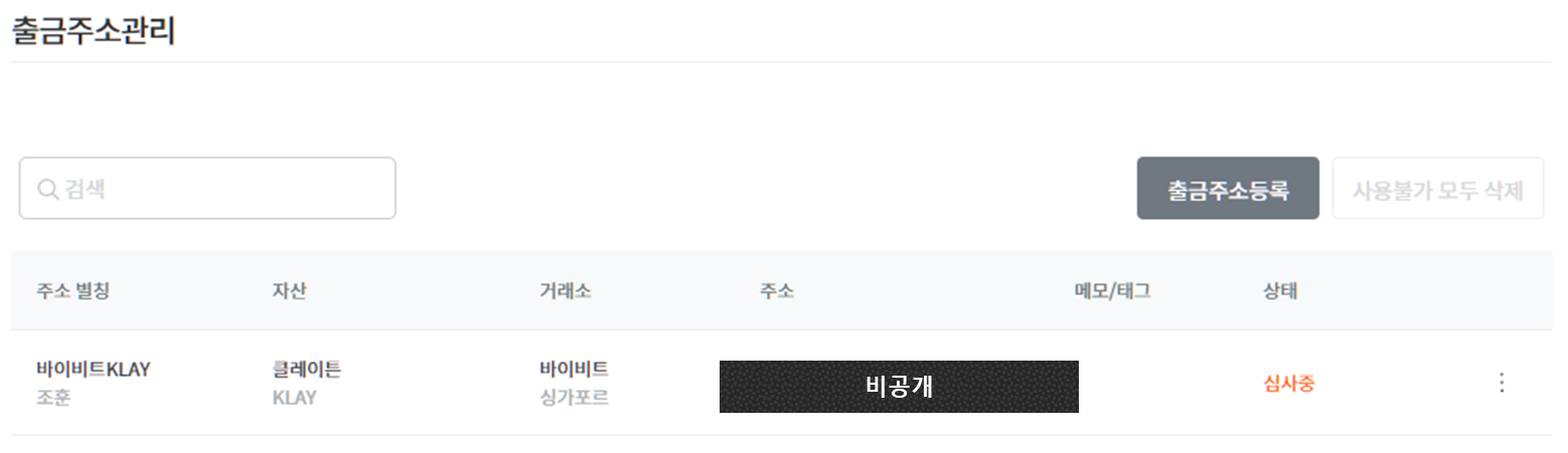(8) 지갑관리 > 출금주소관리에 들어와보면 추가한 지갑 주소가 심사중인 것을 알 수 있음. |