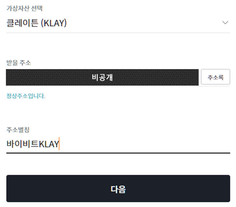 (3) 가상자산 선택 > 클레이튼 선택 후 받을 주소와 별칭을 입력 |
