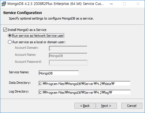 dbpath 옵션을 통해 DB Path를 직접 지정해줌. (C:\MongoDB\db 로 생성하였음)