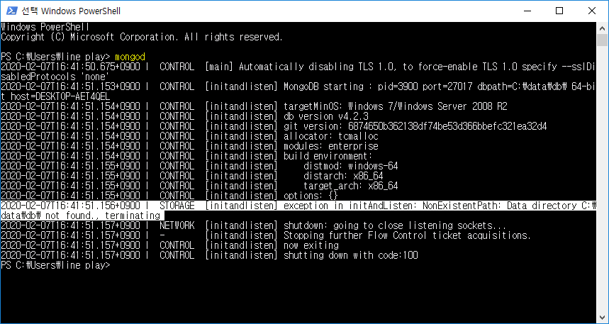 > STORAGE [initandlisten] exception in initAndListen: NonExistentPath: Data directory C:\data\db\ not found., terminating